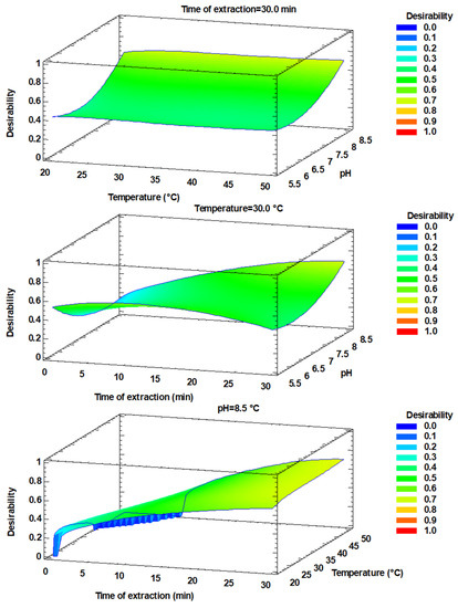 Once the optimal conditions for each response studied were obtained, the method was optimized to achieve the maximum yield in all of them. After multiple optimizations, the overall optimal conditions obtained were 30 min of extraction at 50 °C and a pH level of 8.5 (Table 5). As can be seen in Figure 8, the desirability obtained at the optimal conditions was 0.72. This low result can be due to the different behavior of the studied responses. For instance, in this study, pigment extraction decreased when the temperature increased, while the antioxidant activity had the opposite behavior. This could explain why the temperature did not influence the overall response.