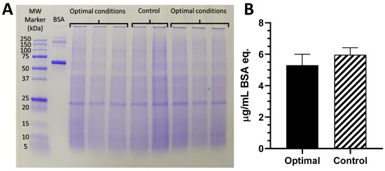 In Figure 9A, the protein profiles of both the optimal and control samples are shown. As can be seen in the figure, there is a strongly marked band above 23 kDa in all of them. According to previous studies, this band fit with fucoxanthin, which has a molecular weight of 17–23 kDa from the fucoxanthin–chlorophyll complex [36,37,38,39]. The quantification of these bands, based on the BSA (Bovine Serum Albumin) standard of 60 µg/mL, is shown in Figure 9B. As can be appreciated, there were no significant differences between the control samples and the optimal ones. Then, it can be concluded that both treatments had a similar fucoxanthin extraction efficiency. Moreover, both treatments were also similar concerning the protein profile, due to there being only one marked band in both treatments.