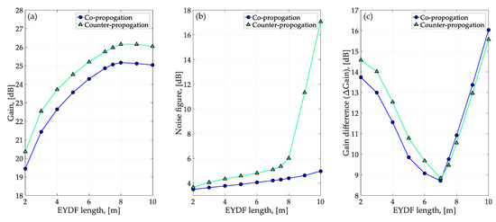 Figure 3a). A longer EYDF does not result in a higher gain, which is explained by the depletion of the pump radiation. A further increase in doped fiber length not only cannot produce additional gain, but the amplified signal power also starts to decrease due to the attenuation of the EYDF itself. Furthermore, the amplifier becomes noisier, especially for the configuration where the signal and the pump are launched in the counter-propagating directions (