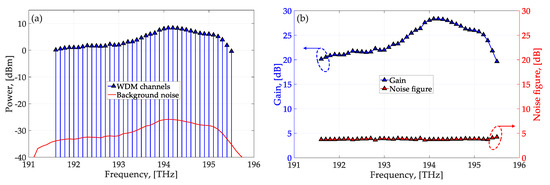 Figure 4b shows the individual gain and noise figure of each EYDFA-amplified DWDM channel. Due to the wavelength-dependent gain and noise figure of the amplifier, the output spectrum is not uniform. Specifically, the amplifier’s output power levels change from 0.1 to 8.3 dBm per channel (dBm/channel, see