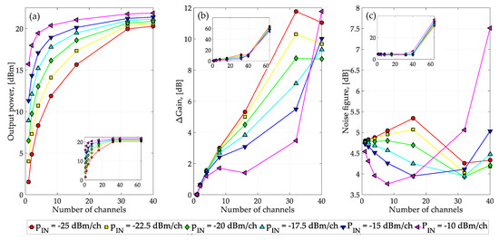 Figure 5a) show that the higher the number of DWDM channels, the smaller the output power difference. The amplifier saturates and eventually it fails to amplify more than 40 DWDM channels even if their power is as low as −25 dBm/channel. When analyzing the output power curve for p