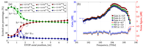3+ percentage becomes smaller (approximately by 5%) and moves further into the EYDF by changing its axial position. Consequently, the depletion of the population inversion is smoothed out on all energy levels, allowing the amplified signal to accumulate a certain part of the pump energy and therefore improving its ability to consume larger portions of the population inversion. This extends the length of the EYDF where the signal amplification occurs effectively, leading to a higher gain (by ~0.7 dB) and a lower noise figure (by ~0.1 dB). On the contrary, for larger cross-sections (k = 1.3), the Yb