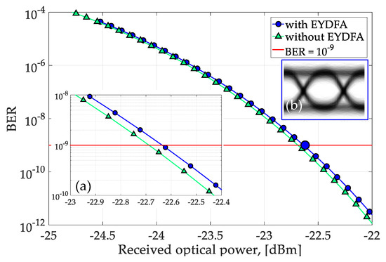 Finally, the BER performance is evaluated for a 40-channel configuration of the DWDM system with and without the EYDFA (see