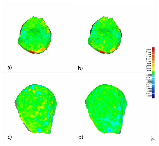 Palatal view of the alignment rate between the segmented and realigned the standard tessellation language 1 (STL1) and STL2 digital files (a) and between the segmented and realigned STL1 and STL3 digital files (b) of tooth 1.5 from the experimental model of the palatal multibracket appliance therapy. Buccal view of the alignment rate between the segmented and realigned STL1 and STL2 digital files (c) and between the segmented and realigned STL1 and STL3 digital files (d) of tooth 1.5 from the experimental model of the buccal multibracket appliance therapy. Warm colors represent a volume increase, cold colors represent a volume decrease, and green represents accurate alignment. Current values expressed in millimeters.