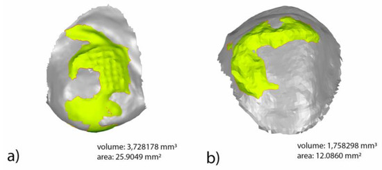 All measurements were obtained from tooth 15 of each experimental model after a randomization procedure (Epidat 4.2, Galicia, Spain). The measurement procedures of the area and volume of remaining cement after buccal and lingual multibracket appliance debonding were performed by superimposing the STL1 and STL2 digital files after analyzing the boundary between the normals of the triangulated surface of the previously segmented and realigned STL1 and STL2 digital files (Figure 2). The spectrum was set to ±100 µm and the tolerance to ±10 µm.