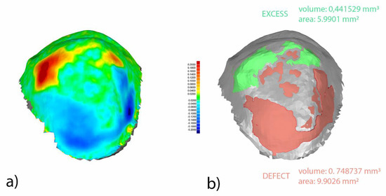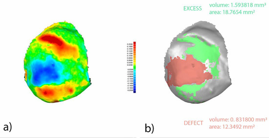 Buccal view of segmented and realigned STL1 and STL3 digital files from tooth 1.5. Warm colors represent a volume increase (remaining cement after cement polishing), cold colors represent a volume decrease (enamel removed after cement polishing), and green represents accurate alignment (a). Boundary for the area and volume measurement of the remaining cement after cement polishing (green) and enamel removed after cement polishing (red) (b). Current values expressed in millimeters.