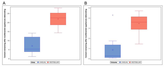 Boxplot of the area (A) and volume (B) of remaining cement after lingual and buccal multibracket appliance debonding. The horizontal line in each box represents the respective median value of the study groups. Blue represents lingual multibracket appliance and red represents buccal multibrackets appliance.