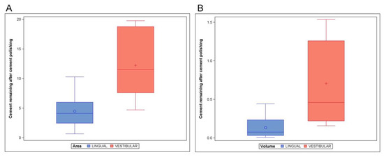 The means and SD values for the area (mm2) and volume (mm3) of remaining cement after cement polishing of the lingual and buccal multibracket appliance therapies are displayed in Table 2 and Figure 6.