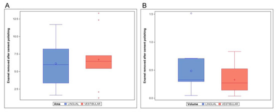The paired t test statistical analysis did not show statistically significant differences (p = 0.709) between the area of enamel removed after cement polishing of the lingual (6.13 ± 2.97 mm2) and buccal (6.71 ± 3.81 mm2) multibracket appliance therapies (Figure 7A). In addition, the paired t test statistical analysis did not show statistically significant differences (p = 0.307) between the volume of enamel removed after cement polishing of the lingual (0.49 ± 0.42 mm3) and buccal (0.33 ± 0.26 mm3) multibracket appliance therapies (Figure 7B).