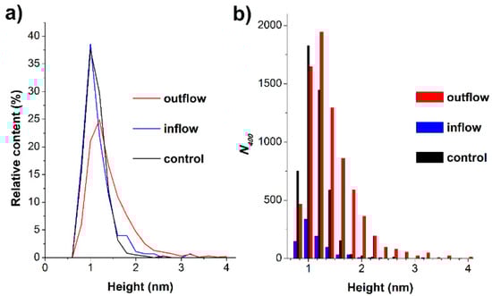 Figure 3 displays the distributions of AFM-visualized objects with height (density function plots) ρ(h) (Figure 3a) and the histogram representing the absolute number of visualized AFM-visualized objects, normalized per 400 µm2 area (Figure 3b).