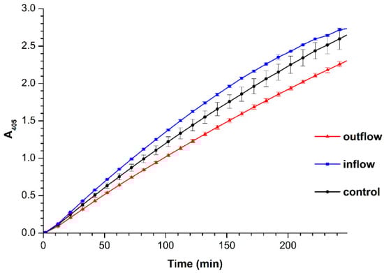 Figure 4 displays the results of spectrophotometry-based estimation of HRP enzymatic activity by the reaction using 2,2′-azino-bis(3-ethylbenzothiazoline-6-sulfonate) (ABTS) substrate. As seen from Figure 4, in comparison with the control HRP solution, no significant change in the ABTS oxidation rate was observed after the incubation of HRP solution near the inflow section of the pipe. On the contrary, after the incubation of its solution near the outflow section of the flow-based system, the enzymatic activity of HRP significantly (by about 18%) decreased.