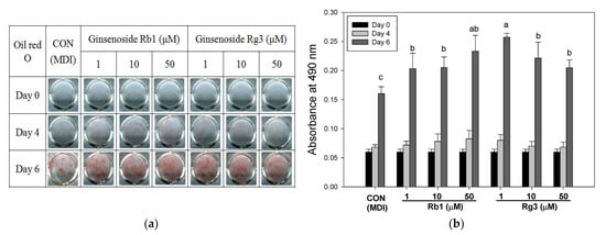 Effect of ginsenoside Rb1 and Rg3 on adipocyte conversion during the differentiation of 3T3-L1 preadipocytes. (a) Oil red O staining at day 0, 4, and 6 with or without ginsenoside Rb1 and Rg3. (b) Lipid accumulation determined by absorbance at 490 nm. Values are the means ± SDs of four samples. a–c Bars with different letters indicate statistically significant differences among groups at p < 0.05.