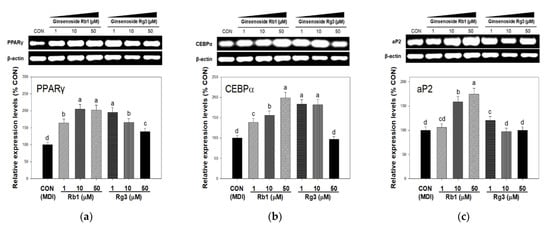PPARγ is known as a master transcription regulator of adipocyte differentiation, and orchestrates with C/EBPα to regulate downstream target genes such as adipocyte protein 2 (aP2). It is well known that PPARγ is also a nuclear receptor for anti-diabetic drugs. Consistent with the effect on adipocyte differentiation, ginsenoside Rb1 dose-dependently enhanced the expression of PPARγ, CEBPα, and aP2 mRNAs at all concentrations used (Figure 2). Moreover, ginsenoside Rg3 exerted its maximal stimulatory effect at 1 μM for the expression of PPARγ, C/EBPα, and aP2 mRNAs during the differentiation of 3T3-L1 adipocytes. In contrast, Rg3 at a high concentration (50 μM) showed inhibitory effects on the expression of C/EBPα and aP2 mRNA, but did not reach statistical significance compared to the control. These results indicate that the effects of the ginsenosides are comparable with respect to morphological changes and molecular responses.