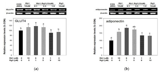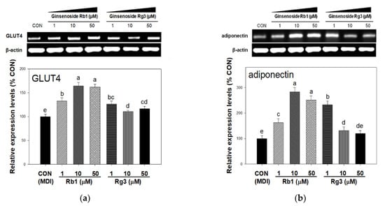 Changes of GLUT4 and adiponectin mRNAs expression by ginsenosides Rb1 and Rg3 during the differentiation of 3T3-L1 preadipocytes. Values are the means ± SD of four samples. a–e Bars with different letters indicate statistically significant differences among groups at p < 0.05.