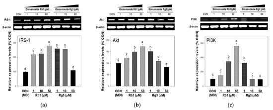 Glucose uptake is regulated by the glucose transport system, which involves insulin receptor substrate 1 (IRS-1) and multiple steps of the phosphoinositide 3-kinase (PI3K)/Akt signaling pathway system [43,44]. Our data showed that Rb1 treatment significantly increased the expression of IRS-1, Akt, and PI3K mRNAs at the concentrations of 1 to 50 μM (Figure 4). However, the effects of Rg3 treatment on the expression of IRS-1, Akt, and PI3K mRNA were in parallel with its regulation on the expression of PPARγ, GLUT 4, and adiponectin mRNAs (Figure 4).
