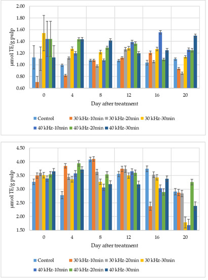 Changes in Trolox-Equivalent Antioxidant Capacity (TEAC) measured as ABTS•+ (2,2′-azino-bis(3-ethylbenzothiazoline-6-sulfonic acid) Cationic Radical Assay (Top) and DPPH· (2,2-diphenyl-1-picrilhydrazil) Radical Scavenging Assay (Bottom) during storage at 4 °C in Passiflora edulis f. edulis Sims pulp (gulupa) subjected to low-frequency ultrasound treatments. Data expressed as mean ± standard deviation of three repetitions.