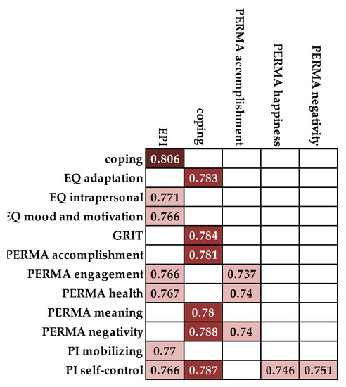 Positive source competencies included the factors of grit and PERMA. PERMA factors are worth considering separately, according to their attributes, such as EQ and PI. Grit, PERMA negativity, and health factors had some incremental predictive power, but the increase was much weaker than in the case of the coping factor (see Table 2).