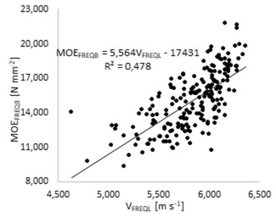 - A strong correlation was also attained between L velocities defined by both methods and MOEFREQB. Thus, MOE in bending could be estimated according to L velocity: VFREQL; the equation is MOEFREQB = 5.564 VFREQL –17431.