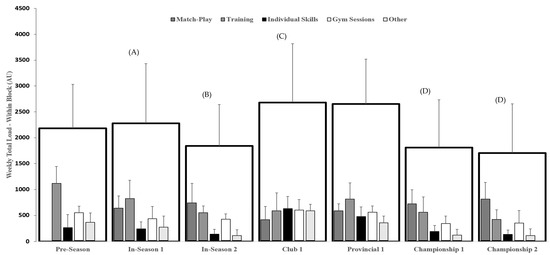 The session RPE (sRPE) training load distribution across phases (large bar) and all modes (small bars) mean ± SD. Abbreviations: AU, arbitrary units. (A) Significant increase in loading between pre-season and in-season 1 (p ≤ 0.05). (B) Significant decrease in loading between pre-season, in-season 1 and in-season 2 (p ≤ 0.05). (C) Significant increase in load between club 1 and provincial 1 and pre-season, in-season 1 and in-season 2 (p ≤ 0.05). (D) Significant decrease in load between in-season 1, club 1, provincial 1, and championship 1 and championship 2 (p ≤ 0.05).
