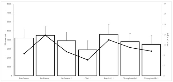 The distribution of high-power meters boxes (m; ≥25 W·kg−1) and average metabolic power line (Pmet; W·kg−1) across seasonal phases within an elite Gaelic football team. All data presented as mean ± SD.