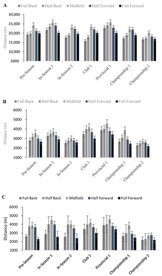 Periodization plans require careful manipulation of training volume and intensity to increase performance levels [8,18,19]. The appropriate application of periodization strategies allows for a more effective prescription of training that respects the natural peaks and troughs of players physical status across a training phase [20]. Accordingly, a balance between training stress, life stressors, match-play, and recovery are significant to improve performance levels and reduce subsequent injury risk [1,8]. Due to the lack of current data available in elite Gaelic football players, the periodization practices of elite teams are currently unknown. Anecdotally, teams will often employ a coach’s training philosophy based on years of coaching experience. However, it is unknown whether the periodization practices adopted demonstrate the necessary variation in training load that is typically associated with existing periodization practices [20]. Additionally, it is unknown if differences exist in loading strategies between playing positions, with positional-difference information limited to match-play data [3,4,5,6,7].