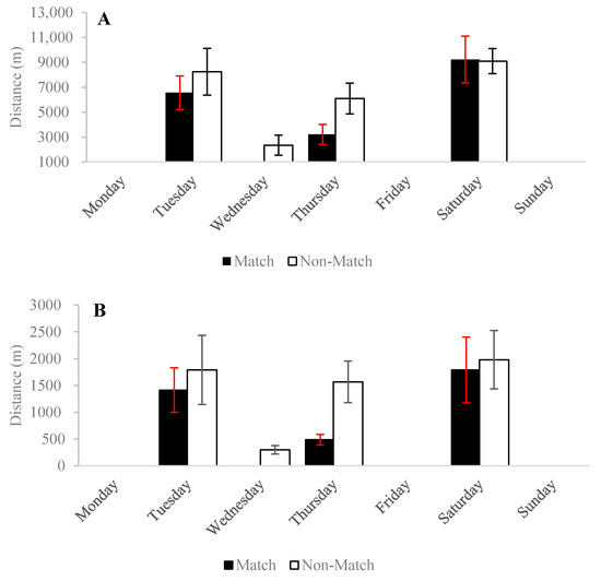 The effect of weekly match context on specific external load measures are presented in Figure 4. During non-match weeks players were shown to have significant (p = 0.045; ES: 0.31–0.89; small-moderate) increases in total distance when compared to match weeks. Similar trends were observed for high-speed running across match and non-match weeks. Increases in high power meters (p = 0.035; ES: 0.31; small) and average metabolic power (p = 0.035; ES: 0.35; small) were also observed across non-match weeks when compared to match weeks.