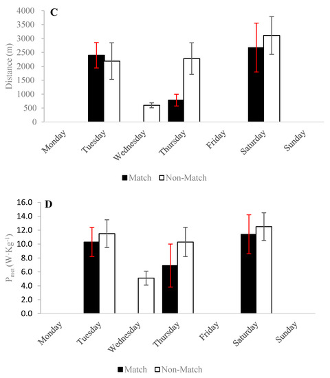 The distribution of external load with respect to match week context (match or non-match weeks) for (A) total distance (m), (B) high speed running (m; ≥17.1 km·h−1), (C) high-power distance (m; ≥25 W·kg−1), and (D) average metabolic power (Pmet; W·kg−1). Data presented as mean ± SD.