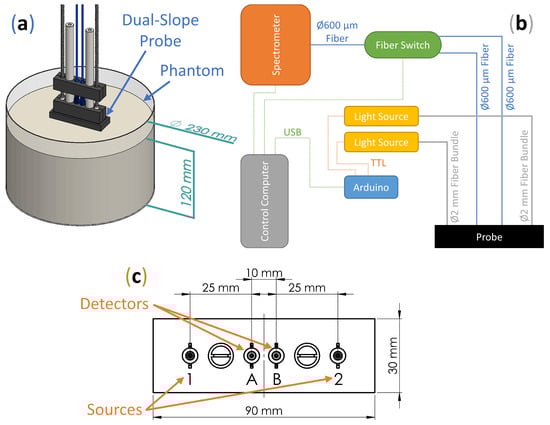 Continuous-Wave broadband Diffuse Reflectance Spectroscopy (CW-bDRS) was implemented with the purpose of measuring absolute absorption spectra of optically diffusive media (Figure 2a). This was realized using a Dual-Slope (DS) optode geometry which allowed for calibration free measurements of the CW reflectance slope (versus source-detector distance). The DS optode configuration (Figure 2c) used was the same as described previously [26]; it contains two source positions and two detector positions. The linearly symmetric arrangement resulted in a calibrated measurement of the slope (versus source-detector distance) of CW reflectance from 25 to 35 mm.