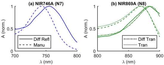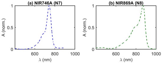 Expected spectral features of near-infrared dyes in water, provided by the manufacturer (QCR Solutions, Palm City, FL, USA). [37] (a) Normalized Absorbance (A) versus wavelength () of NIR746A dye (N7). (b) Normalized A of NIR869A dye (N8).