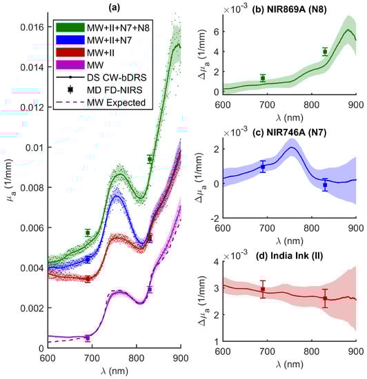 First, before any dyes were added (just Milk and Water; MW), the phantom was measured to yield an absorption spectrum dominated by water (Figure 4a). This MW spectra had the expected spectral features of water (hump at about 750 nm and sharp increase starting at about 800 nm) [41]. Further, the expected MW spectrum agrees (within error) with the experimental data for the spectral range between 690 nm and 830 nm, where the reduced scattering coefficient is interpolated (not extrapolated) from the MD FD-NIRS measurement. Below 690 nm, the agreement is lost likely due to the very low water absorption, such that, even low absorption, contributions from fat, proteins, or other milk constituents in the MW medium may become detectable. Above 830 nm, the agreement also degrades possibly because of incorrect reduced scattering values (from extrapolation) or contributions from other absorbers in the milk other than water. Overall, the quantitative agreement between the expected and measured MW spectra are quite good with a coefficient of determination () of 0.98, indicating an accurate measurement of absolute absorption by DS CW-bDRS.