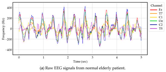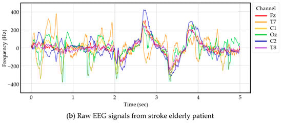 The data used in the experiments in this paper consist of three types: (1) raw EEG data collected from the brain wave measurement sensor; (2) absolute power value expressed by measuring absolute brain wave values regardless of external conditions such as scalp resistance, skull thickness, etc.; (3) relative power values to control for the difference in external states. The collected raw values that were imprecise were removed prior to learning, and a Z-score technique was applied on a channel-by-channel basis to complete the normalization process. The finalized data that had been preprocessed were then tailored to the input frame of the learning model. Finally, the number of selected EEG data stroke patients used in the experiment was matched to the number of EEG data for the general elderly. Figure 3 below shows an example of the actual raw data values collected from six channels of brain waves measured and collected in real time. Figure 3a presents randomly selected EEG general elderly data and Figure 3b presents randomly selected stroke elderly data collected during walking.