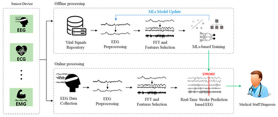 The module proposed in this paper uses real-time EEG biometric signals to detect and predict elderly stroke precursors in advance, and it consists of two submodules in total. The offline submodules provide predictive models via Machine-Learning (ML) Training, which performs machine-learning model-specific learning from the preprocessing of brainwave signals. Meanwhile, the online sub-module provides medical staff with the risk of stroke in older adults based on real-time EEG data as shown in Figure 4.