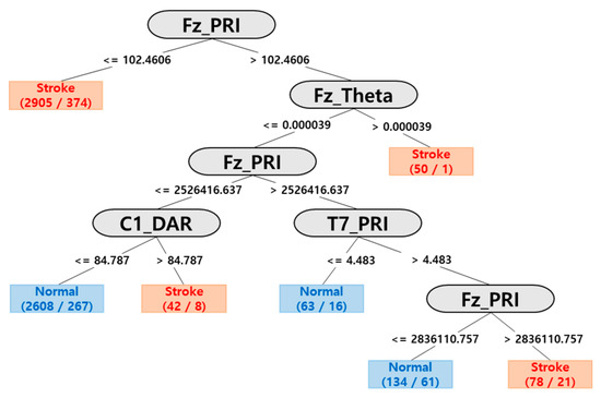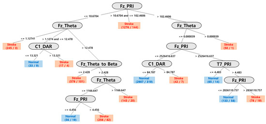 The second experiment is the same as the first experimental scenario, and we proceed with relative values instead of power values. In other words, both experiments were conducted by dividing the data into 80% for the learning data and 20% for the test data, in Section 4.3.2, which achieve stable performances of 83.8% and 87.7%, respectively, in prediction accuracy (85.6%), along with reproducibility and precision. The performance indicators, including prediction accuracy, were slightly lower than those of the experiments with power values, but they were identified when relative values were used, and none of the key attributes of power values were present. Figure 7 shows a decision tree for predicting stroke conditions in the elderly with only 15 attributes by applying the relative value as CFS. Experiments have shown that in the construction of decision trees, only 15 of the 66 relative value attributes defined by the system can accurately predict stroke precursors for normal and stroke elderly. Seventeen rules can be obtained from Figure 7.