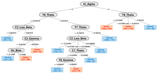 In this section, we conduct a semantic analysis of stroke disease in the elderly using the power value of EEG based on the C4.5 algorithm among decision trees, a representative classification and prediction model of machine learning. In the first experiment, as a semantic analysis of the rules on predicting stroke conditions in older people, we randomly extracted and learned the power values of 2352 sets of data from both normal elderly and stroke patients, and we conducted testing with 588 data sets for normal elderly and stroke patients who did not participate in the learning. This section describes the experimental results of the C4.5 DT algorithm in the fourth experiment based on Equation (1) in Section 4.3.1. In the C4.5 DT algorithm, when 80% of train data and 20% of test data were applied, satisfactory prediction accuracy (86.39%), and stable performance of 86.4% for recall and precision was confirmed. Figure 5 shows a decision tree for predicting stroke conditions in the elderly with only eight attributes by applying the power value as CFS. In the construction of the decision trees, we showed that only eight of the 66 power value attributes defined by the system can be used to accurately classify and predict normal elderly and stroke patients. Here, the number in the leaf node is the corresponding class by learning data, which means the exact number of predictions and the number of incorrect predictions. Fourteen rules can be obtained from Figure 5. Summarizing Figure 5, the Fz channel values from the power values are analyzed as the main attributes. This was analyzed and confirmed by experiments indicating that the precursors for stroke disease in older people were significant in the frontal lobe of the brain. Further, as shown in previous studies, attribute values such as _to_(/), PRI(+)/(+), and theta () are well identifiable and predictable for the characteristics of stroke patient brain waves.