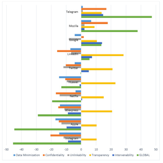https://useguard.com/ (accessed on 16 February 2021)) for the seven policies that the latter application has already rated, which are, Instagram, Twitter, AliExpress, Netflix, LinkedIn, Mozilla and Telegram. We chose this application because it is the only related work that provides ratings of policies that have been updated according to the legal framework of the GDPR, and that also considers a similar set of services. As mentioned previously, the ratings provided by Guard for each policy consist of a single mark between A+ and F, which aggregates heterogeneous criteria such as generic privacy threats and scandals starred by the company. To quantify the agreement between the two approaches, we measured the correlation between the ranking resulting from sorting policies according to Guard’s ratings, and the ranking obtained by sorting the same policies by our global score. Correlation was measured by means of the Spearman’s rank correlation coefficient, which assesses how well the relationship between the two scoring criteria can be described using a monotonic function (linear or not). In this way, we avoid depending on the scale of each scoring criteria and we can focus on the relative rankings they define. We obtained a high correlation value of 0.839, which indicates a strong direct association between the two scores, even though they may consider different criteria.