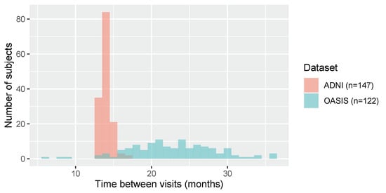 Distribution of time between visits in the considered ADNI and OASIS datasets.
