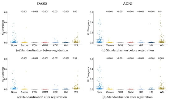 We measured the quality of standardisation by determining whether histograms of baseline and follow-up scans were similar, in terms of the KL divergence, after standardising intensities or not. The measured KL distance is shown in Figure 3. In most cases, standardising intensities between baseline and follow-up scans resulted in significantly lower KL divergence values (p < 0.001), except when using WhiteStripe. The situation may be explained by the large variation in the left-most tails of the resulting histograms of intensities (See Appendix A). This variation results in a higher mismatch between histograms of intensities and, thus, in higher KL divergence.