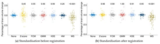 We examined the degree of similarity between histograms of intensity of baseline and follow-up scans before and after standardisation as a measure of the quality of the standardisation process per se. Given that an intensity standardisation method maps histograms to a normalised space, we expected its use to lead to lower KL divergence values. Indeed, we observed that inter-subject inter-scan variability was reduced with the use of most intensity standardisation methods, except for WhiteStripe for which the KL divergence was comparable to that measure without standardisation. A closer examination of the histograms of intensity in Figure A1 and Figure A2 revealed that standardising intensities with WhiteStripe led to high coincidence in the white matter mode, but less coincidence in grey matter and cerebrospinal fluid modes. A similar observation was highlighted by Fortin et al. [].