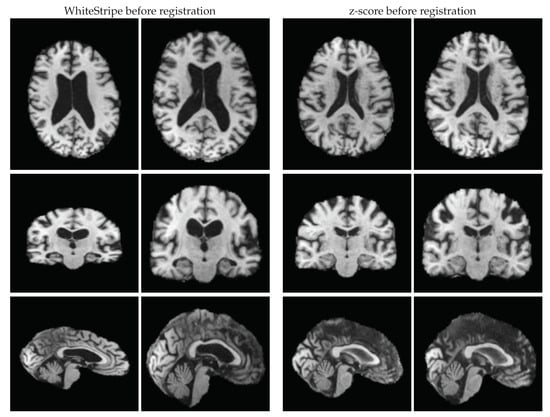 Estimated annual brain volume changes also differed depending on whether intensity standardisation was carried out or not. We noticed two clear trends in this regard. First, the application of histogram matching resulted in more similar estimates for both Alzheimer’s disease patients and normal control subjects, even more similar than those detected without standardisation. This situation may be reflective of a potential under-detection of the actual atrophy due to information loss (e.g., contrast loss) after the application of histogram matching. Second, standardising intensities with z-score and WhiteStripe before registering baseline and follow-up scans resulted in lower effect sizes compared to those obtained when applying them afterwards (z-score: 0.39 vs. 0.45 in OASIS and 0.27 vs. 0.45 in ADNI; WhiteStripe: 0.37 vs. 0.44 in OASIS and 0.02 vs. 0.46 in ADNI). After inspecting the registration outputs, we noticed that standardising with these two techniques prior to registration led to unsatisfactory outcomes in numerous cases (ADNI: 63 with WhiteStripe and 26 with z-score; OASIS: 24 with WhiteStripe and 44 with z-score). Some examples of this issue are shown in Figure 5. On the other hand, the application of these two techniques after registration led to some of the highest Cohen’s d values in both datasets.