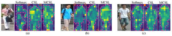 To compare more depth about the three loss functions, we conduct an experiment on their class activation maps in Figure 3. Color temperature means importance in producing gradients associated with the target identities, indicating that warmer colors and sharper outlines demonstrate better performances. The rough outlines of results are drawn with pink dotted curves. In Figure 3a, the outline of MCSL has sharper and more similar shape with that of the person in the input image than those of softmax and CSL. In Figure 3b,c, the color in the outline of MCSL is warmer than those of softmax and CSL. Moreover, red boxes in Figure 3 denote the backgrounds that are mistakenly identified with target in outlines of both softmax and CSL, whereas not in that of MCSL, which indicates that MCSL outperform others in class activation mapping.