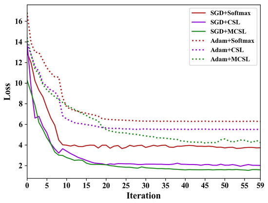 Figure 5 demonstrates the mean training loss curves from 5 runs of the three functions, i.e., softmax, CSL, and MCSL optimized by Adam [48] and stochastic gradient descent (SGD) on the Market-1501 dataset. The training curves of softmax loss function optimized by Adam and SGD decline slowly after the 20th and 15th iterations, respectively. Comparatively, the convergence of CSL in the early stage is accelerated due to the cosine space mapping, but it converges slowly in after the 25th iterations. The curve of MCSL optimized by Adam vibrates greatly in the final training stage, showing a clear confrontation between MCSL and Adam [49]. MCSL optimized by SGD can suppress the inconsistency and achieve a high accuracy from Figure 5, so we use SGD to optimize our training model in this paper.