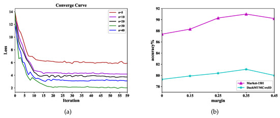 In this paper, experiments are performed on the selection of the loss parameters s and m in Equation (4). The scaling parameter s in the proposed MCSL controls the dependence degree of the loss to the cosine space, which cannot be adaptively learned to prevent slow network convergence and relatively difficult optimization. As shown in Figure 6a, we found that if s is set too small, the loss will decrease slowly and may not even converge. Therefore, s is set to a larger value in this paper for better performance and training loss reduction. In addition, the margin parameter m can also be selected, as shown in Figure 6b. We set m to 0.35 in our paper because of the highest accuracy in both the Market-1501 and DukeMTMC-reID datasets.
