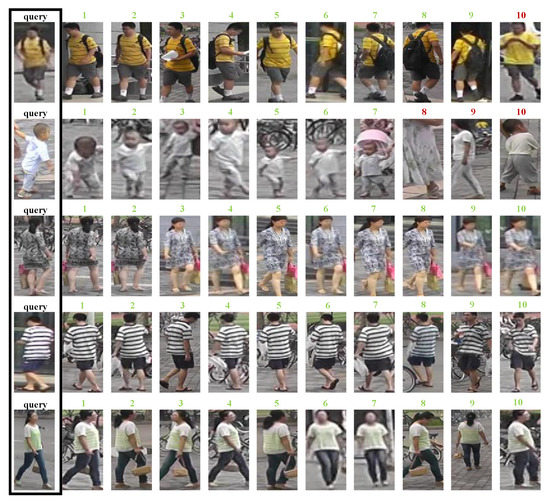 The visualization result of the proposed method is shown in Figure 7. People in different rows represent different pedestrian sample images in the Market-1501 dataset. Images in the first column denote the query graph, and the retrieval images are sorted according to the cosine similarity from 1 to 10. As seen from the sorting order, most of the retrieval images are selected correctly, but there are still some incorrect images marked with a red number. This failure probably occurred because of the insufficient image information collected from single view cameras.