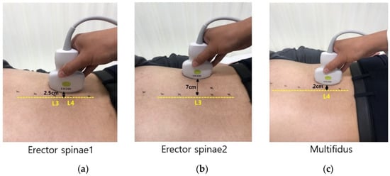 Location of ultrasound probe to measure skin thickness, muscle thickness, and shear-wave elastography (SWE). (a) Erector spinae 1; (b) erector spinae 2; and (c) multifidus.