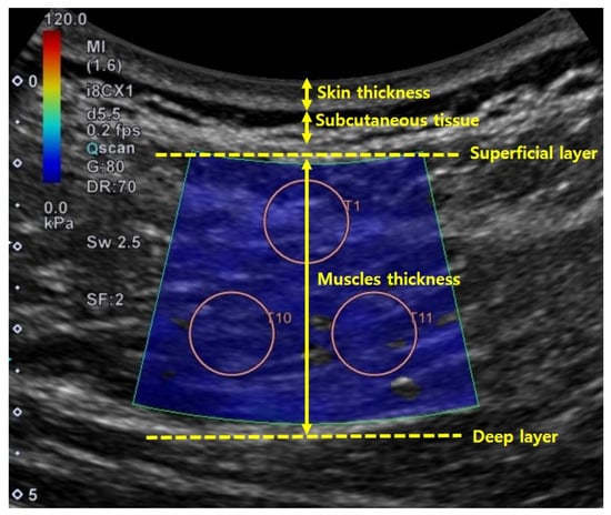 Skin and muscle thicknesses were measured from the collected shear-wave ultrasound images using Image J 1.52a (National Institutes of Health, Bethesda, U.S.). Skin thickness was measured as the distance (cm) between the surface of the epidermis and the subcutaneous tissue. Muscle thickness was measured as the distance between superficial and deep muscle facias. Both skin and muscle thicknesses were measured by drawing a straight line through the center of the image [26] (Figure 4). Skin and muscle thicknesses were measured using one shear-wave ultrasound image per muscle and condition.
