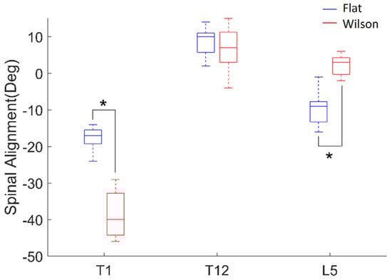 Spinal alignment (deg) of thoracic curvature angle at T1 and T12, and lumbar curvature angles at L5 from postures on flat (blue) and Wilson (red) tables. Each box plot indicates 25th (Q1), 50th (Q2), and 75th (Q3) data percentiles. Whisker indicates Q3 + 1.5 × (Q3 − Q1) and Q1 − 1.5 × (Q3 − Q1). *, p < 0.05.