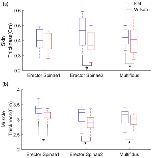 (a) Skin thickness in sites used to measure erector spinae 1 and 2, and multifidus; (b) muscle thickness based on flat (blue) and Wilson (red) table postures. Each box plot indicates 25th (Q1), 50th (Q2), and 75th (Q3) data percentiles. Whisker indicates Q3 + 1.5 × (Q3 − Q1) and Q1 − 1.5 × (Q3 − Q1). *, p < 0.05.