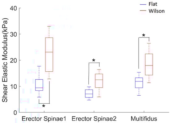 Shear elastic modulus of erector spinae 1, erector spinae 2, and multifidus muscles while in flat (blue) and Wilson (red) table postures. Each box plot indicates 25th (Q1), 50th (Q2), and 75th (Q3) percentiles of the data. Whisker indicates Q3 + 1.5 × (Q3 − Q1) and Q1 − 1.5 × (Q3 − Q1). *, p < 0.05.