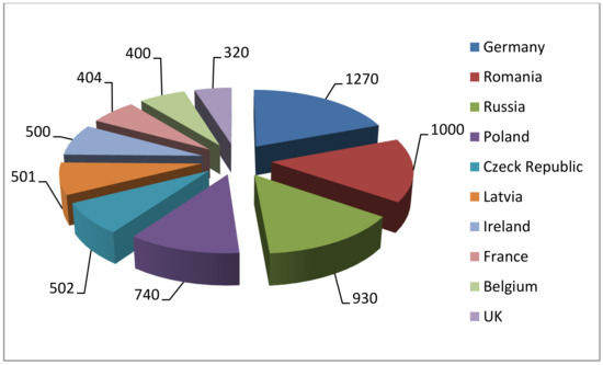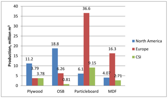 The United Nations Economic Commission for Europe (UNECE) [2] showed that the level of plywood and OSB in 2015 was higher in North America than in Europe and CSI, but the production of OSB and MDF (medium-density fiberboard) was much higher in Europe than those two comparison regions (Figure 1). Also, if we compare the production capacities for the countries of Europe and Asia (United Nations Economic Commission for Europe area), it can see that on the top there are countries like Germany, Romania, and Russia, and countries like France and UK are only in positions 8 and 10, respectively (Figure 2).