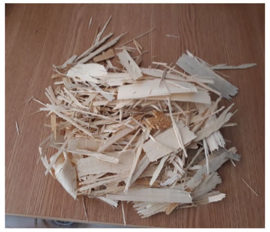 The strands needed for the experiments were taken from Kronospan Trading SRL (Brasov, Romania), immediately after their cutting (Figure 4 and Figure 5), of the four wood species thought to be used: spruce (Picea abies), pine (Pinus sylvestris), poplar (Populus tremula), and willow (Salix alba).